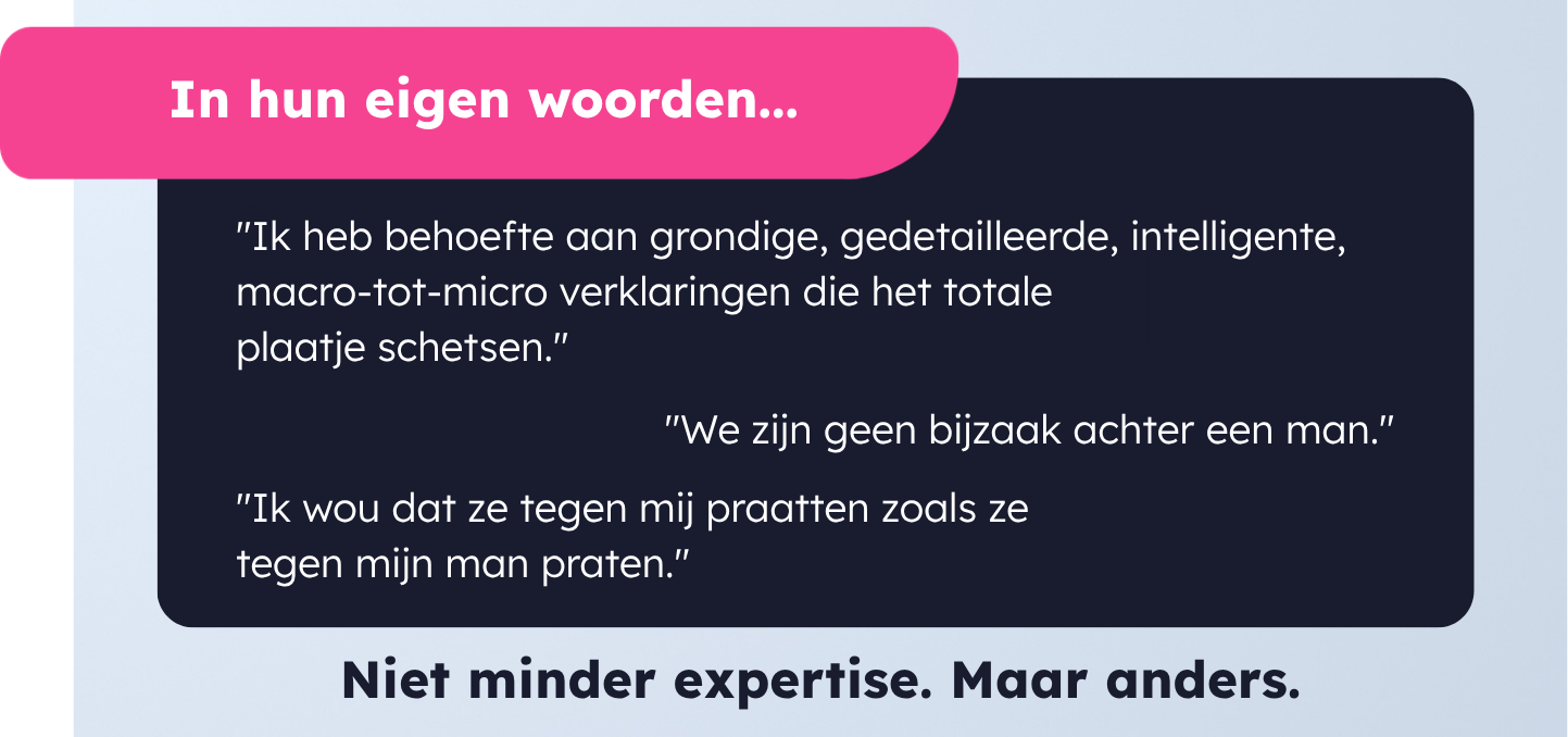 - Heldere taal, geen jargon (39%) Geen kinderachtige uitleg, maar een respectvolle verheldering. Zoals een van de respondenten het verwoordde: "Ik heb behoefte aan grondige, gedetailleerde, intelligente, macro-tot-micro verklaringen die het totale plaatje schetsen." Ze willen het begrijpen, niet enkel gerustgesteld worden.